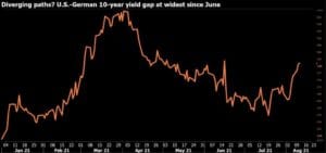 Still, the gap between 10-year German and U.S. Treasury yields widened to 182 bps on Wednesday before the data, the largest since June, as German bonds continued to outperform U.S. Treasuries this week.