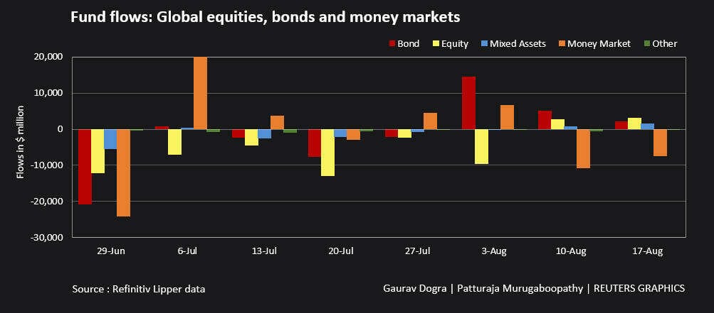 (Reuters) – Global equity funds received inflows for a second straight week in the week to Aug. 17, as investors tempered their expectations for the peak of the U.S. interest rate hike cycle, with a fall in commodity prices pointing to cooling price pressures.