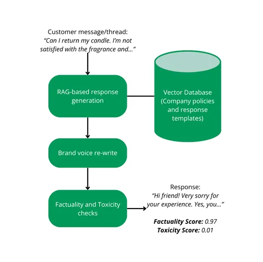 In addition to the promotional planning tools, Prediction Guard has pioneered an LLM-powered customer service system for e-commerce customers leading up to the holiday rush. Using the latest LLMs (again, hosted in IDC), this system can respond to customer email queries accurately in the brand’s unique voice, while seamlessly analyzing the context from prior conversational exchanges. These conversational exchanges are kept private and LLM responses are validated and de-risked using Prediction Guard’s unique factuality and toxicity checks. (Refer to Figure 4)