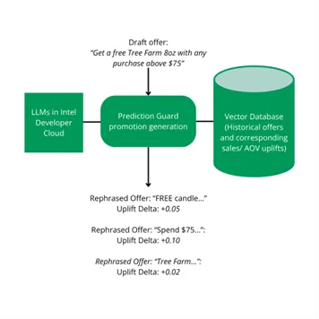 Finally, to enable marketers to be responsive and dynamic, privately hosted LLMs (in Intel Developer Cloud on Gaudi2) proactively rephrase or rewrite draft offers in ways that increase forecasted uplifts. A company can put a draft offer into this promotion planning tool and request that the tool generates similar offers having the same basic parameters (e.g., a certain percentage off) but with wording that will outperform the draft wording. LLMs are great at this task and are able to act in an agentic way reasoning over the historical sales uplift data and iteratively rephrasing the offers to find better wording (i.e., Figure 3).