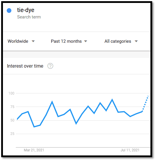 Following on from the enduring retro trend, tie-dye has made strides this year, featuring everywhere from Paris runways to TikTok videos. A quick look at Google Trends shows that the search term “tie-dye” has been creeping up since March 2021, so it certainly looks set to make a vibrant burst of colour in our wardrobes this autumn.
