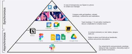 At Remagine, we’ve created a pyramid of remote team communications, with synchronous modes in the top tiers and asynchronous modes in the lower tiers. For fully remote companies, the asynchronous layers at the bottom can often be the most effective. For us that’s Slack, but this could be any platform. Asynchronous communication can provide the bedrock of all communications for fully remote startups. As you climb the communications pyramid, you reach document sharing, calendar platforms, and finally company get-togethers, conferences, and workshops. The very top is reserved for emergency contact only, for example in emergencies.
